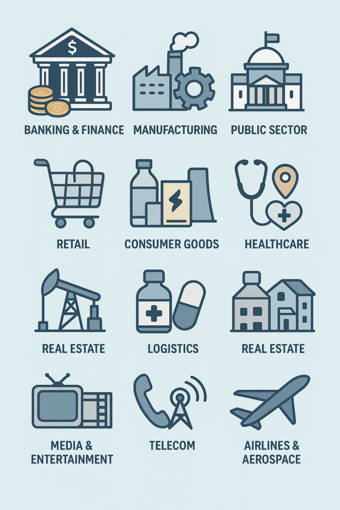 Industries we Serve Banking & FinanceManufacturingPublic SectorRetailConsumer GoodsEnergyHealthcare LogisticsReal EstatePharma & lifesciencesMedia & EntertainmentTelecomAutomotiveAirlines & Aerospace